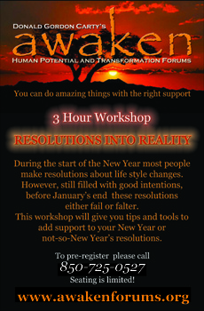 “How do we break the cycle of breaking our personal resolutions? First of all it is important to understand that, resolutions are a process, not a one-time effort of will power that offers you a chance to create new habits,” says Donald Gordon Carty creator and facilitator of the two-evening workshop ‘Resolutions Into Reality’. Trying to change and do something positive for ourselves is the fastest way to come right up against our deepest sources of resistance and come face-to-face with our most negative beliefs and self-sabotaging tendencies. And that’s why we fail or falter. So, rather than deny this dynamic, I like to show people how to be aware of the subtle forces that are at work in their minds and bodies and their tendencies to go unconscious in certain situations. I am delighted to be able to offer this two-evening workshop again in the Atlanta area that will give participants insights that will add support to their New Year or not-so-New Year’s resolutions.”